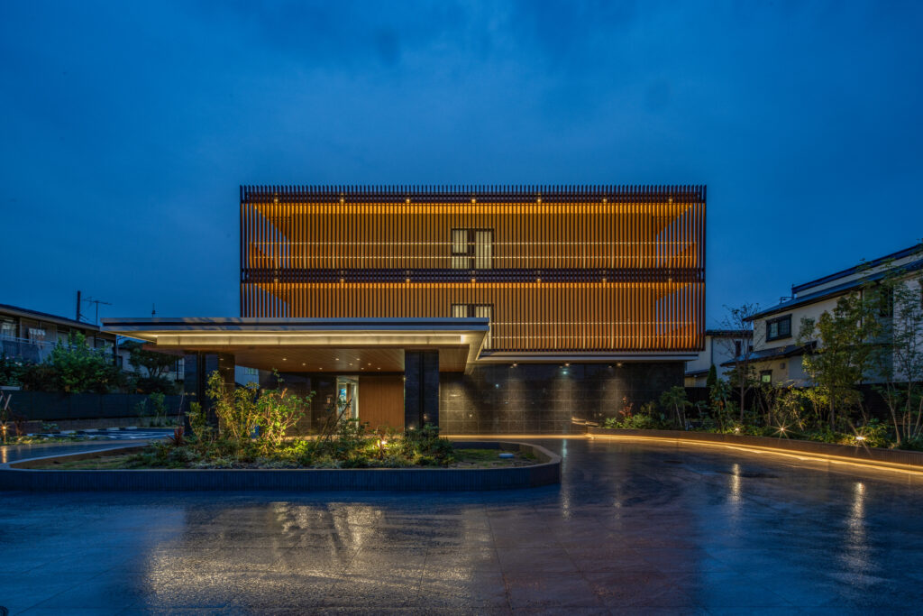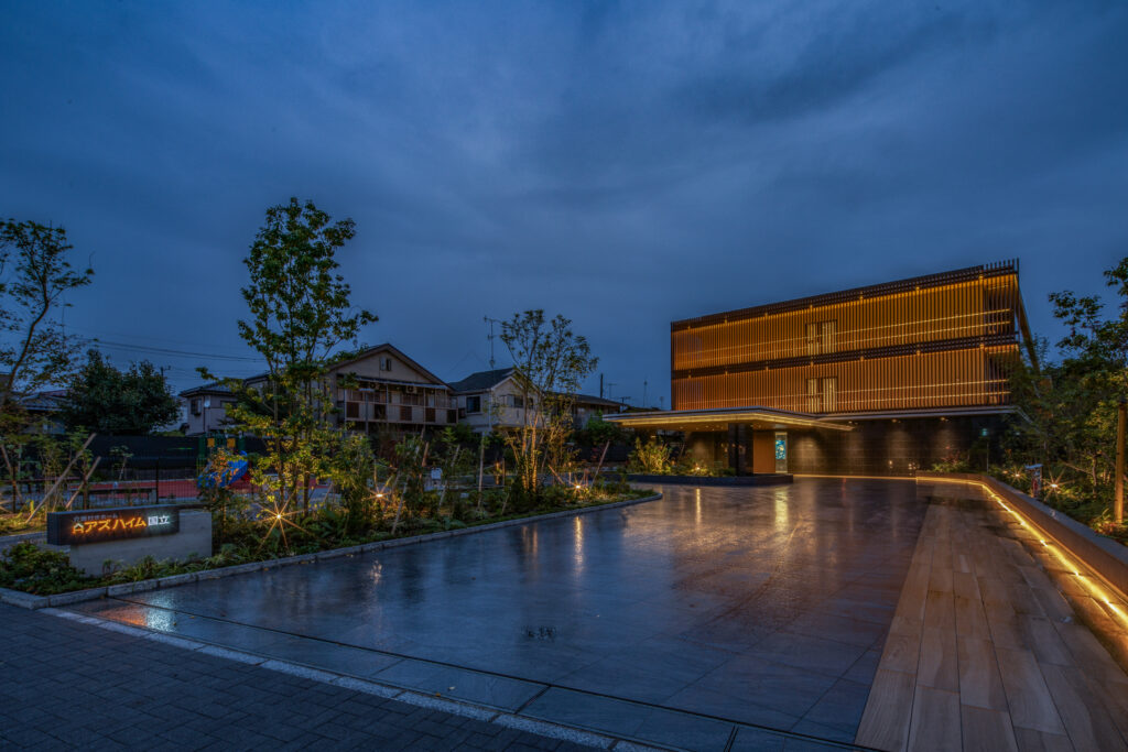 夜間にはファサードやアプローチに設えた照明が、建物と植栽を柔らかな光で浮かび上がらせ、森の中に静かに佇む美術館のような風景をつくり出しています。