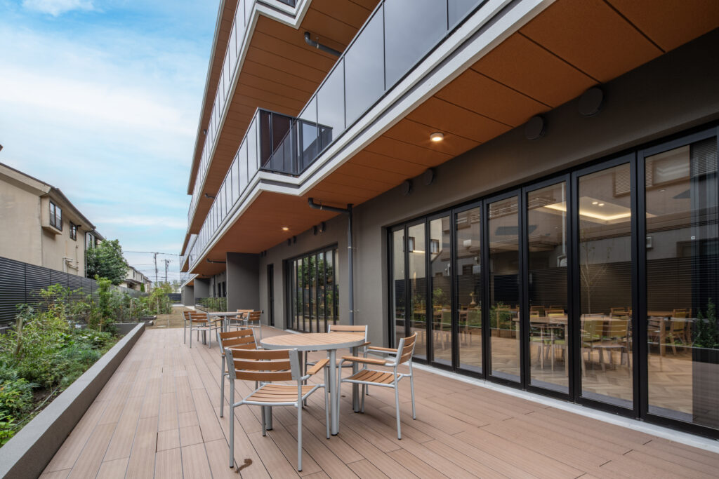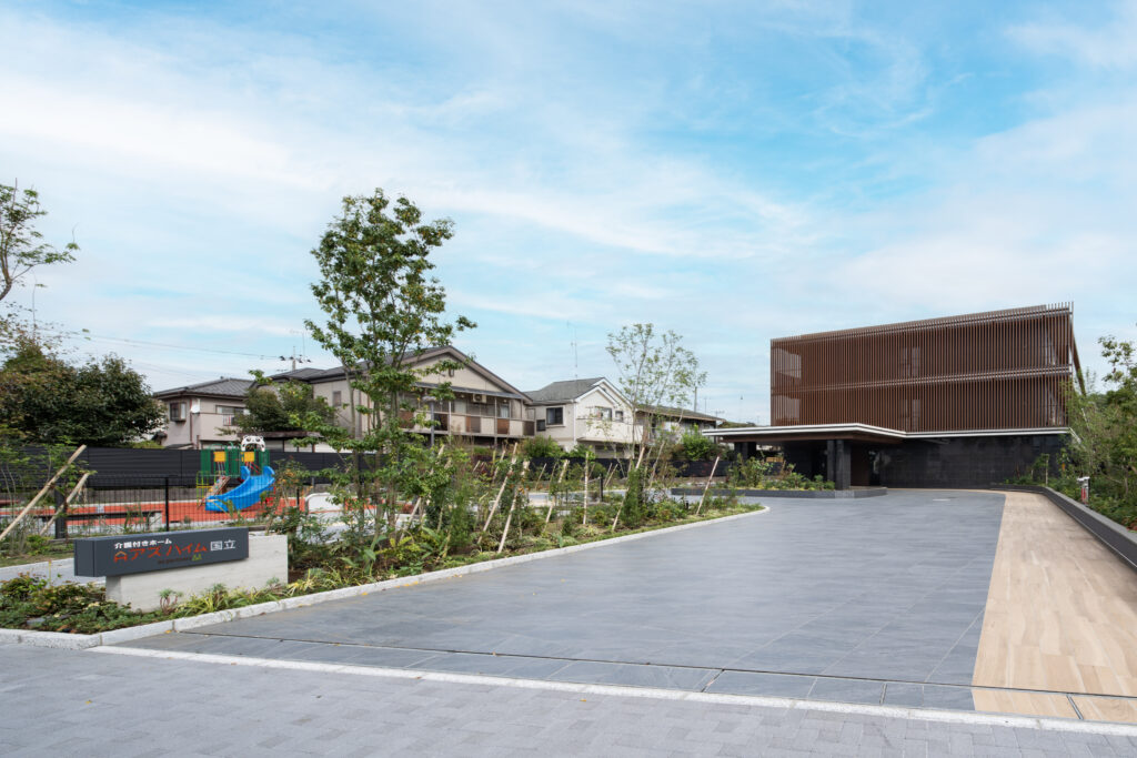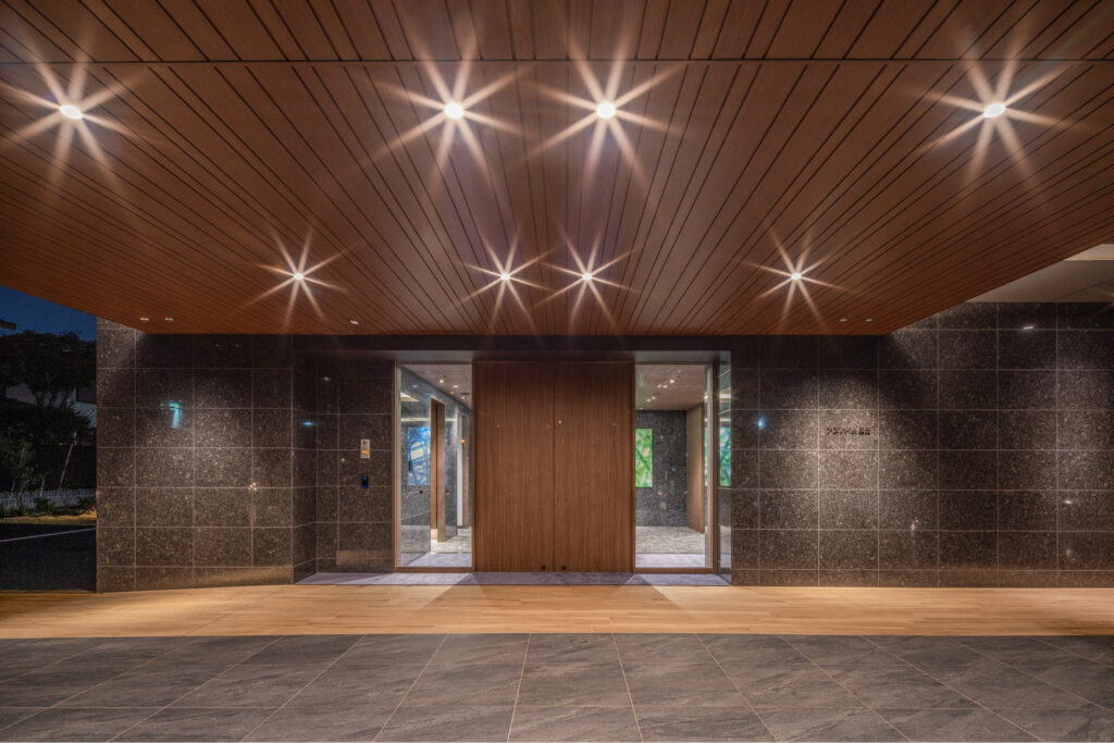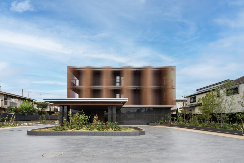 外観は黒を基調とした仕上げに木目調ルーバーを重ね、周囲の植栽と調和する落ち着いた佇まいとしました。