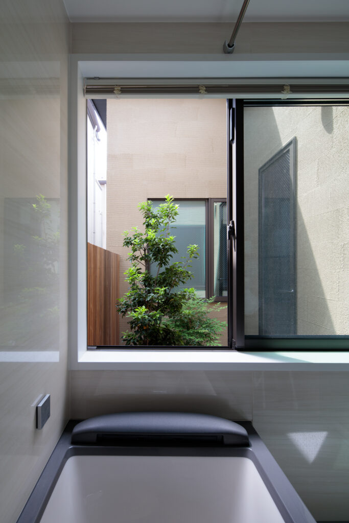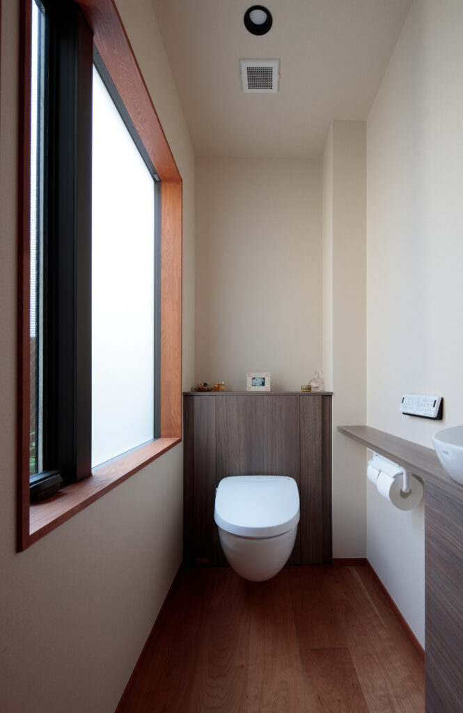 外壁には落ち着いたトーンで表情をつけた塗壁材を用い、濃色の木材と組み合わせることで、和モダンの落ち着いた佇まいをつくりました。