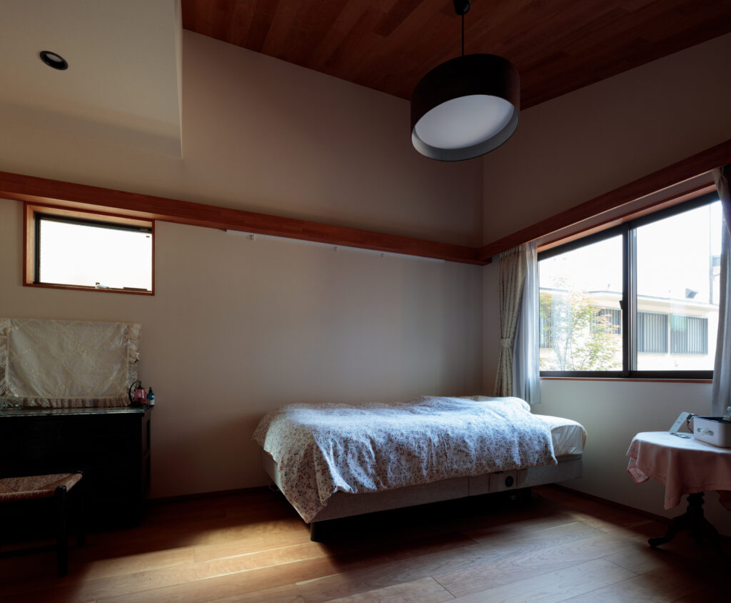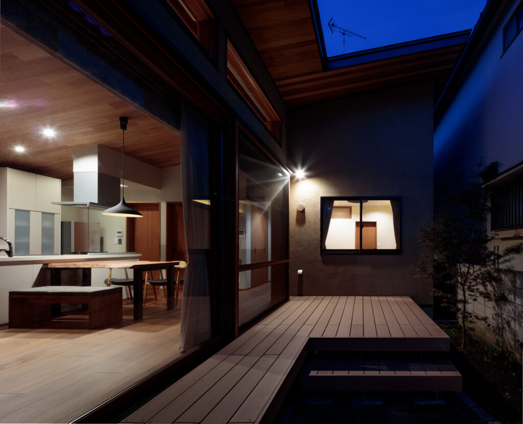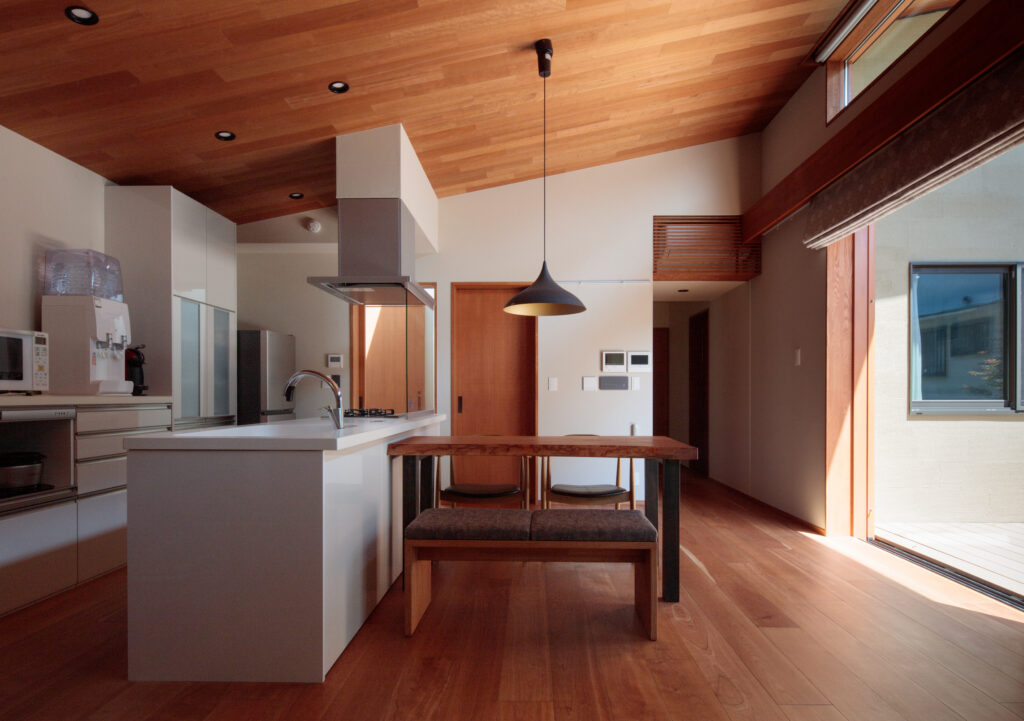 平屋でありながら広がりを感じられるよう、LDKの天井は片流れ勾配とし、庭側に向かって大きな開口を設けました。ウッドデッキを介して室内と庭を緩やかにつなぎ、内外が一体となる住空間を構成しています。